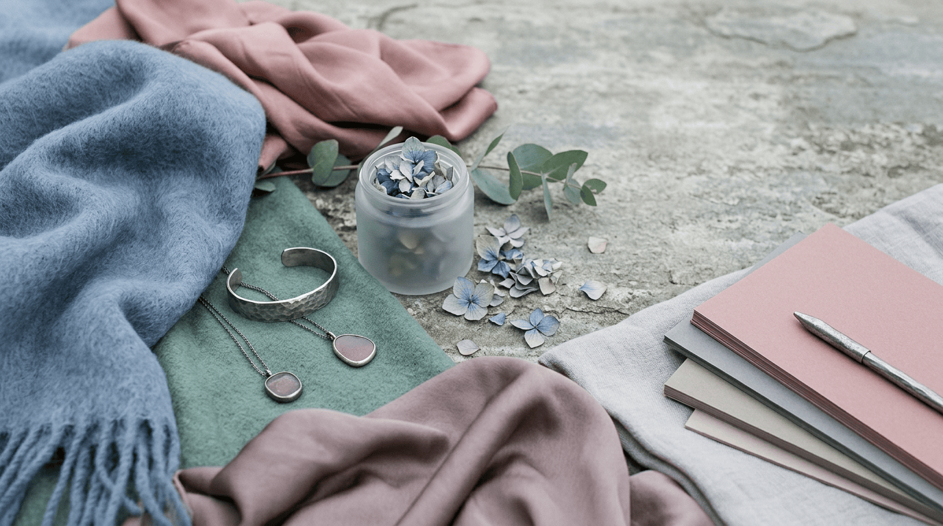 - Start with blue-grey, muted rose, sage, and plum.